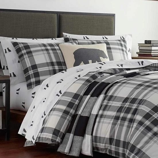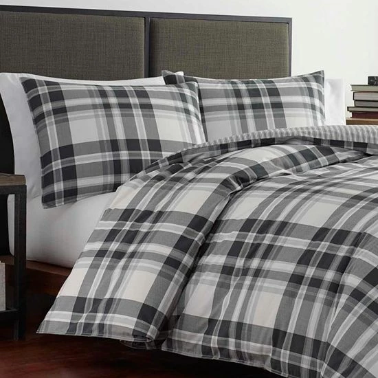 An iconic plaid makes a bold statement in black and white with grey accents, perfect for a modern cabin in the woods or an urban retreat in the city.