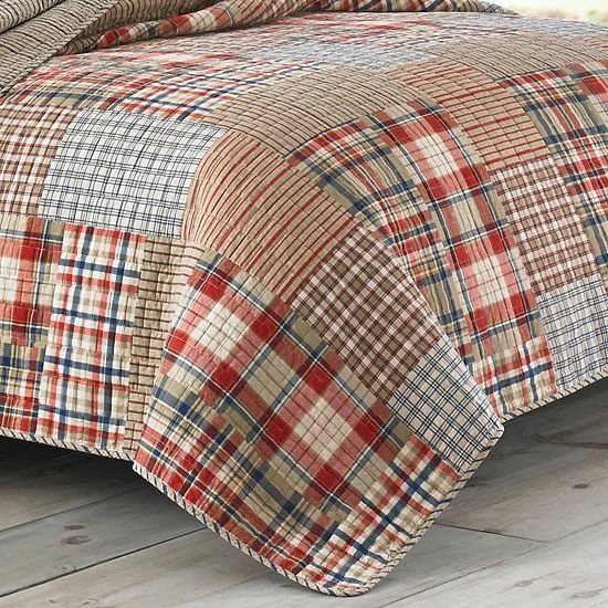 - Signature plaids and shirting stripes are pieced together in a rectangular block patchwork with a relaxed attitude