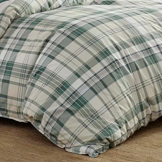 A boldly scaled plaid in shades of forest green and pale khaki on white creates a warm and welcoming atmosphere as soon as you walk into the room.