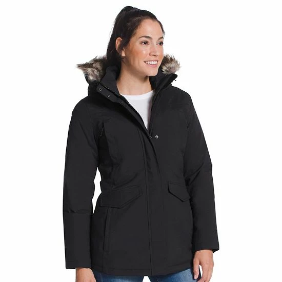 - Attached hood with removable faux-fur trim